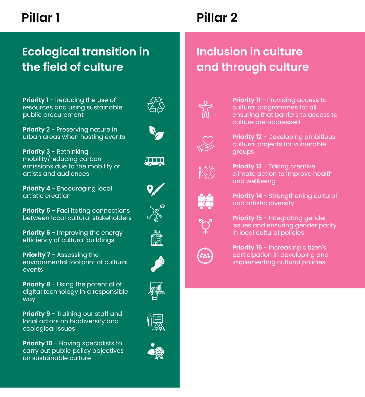 The Call to Action is organised around two pillars and 16 priorities, providing a flexible framework for cities to adapt to depending on their local contexts.